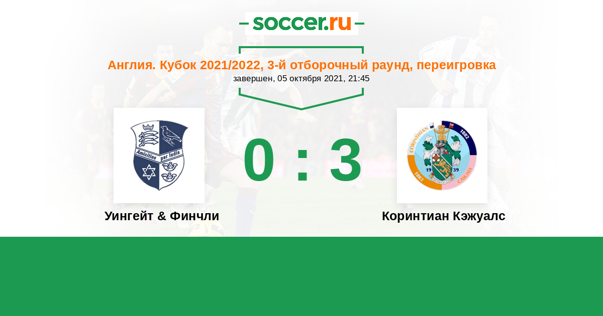 Англия. Кубок 02.10.2021 Коринтиан Кэжуалс Логотип футбольный клуб Коринтиан Кэжуалс (Лондон) 1:1 Логотип футбольный клуб Уингейт & Финчли (Лондон) Уингейт & Финчли