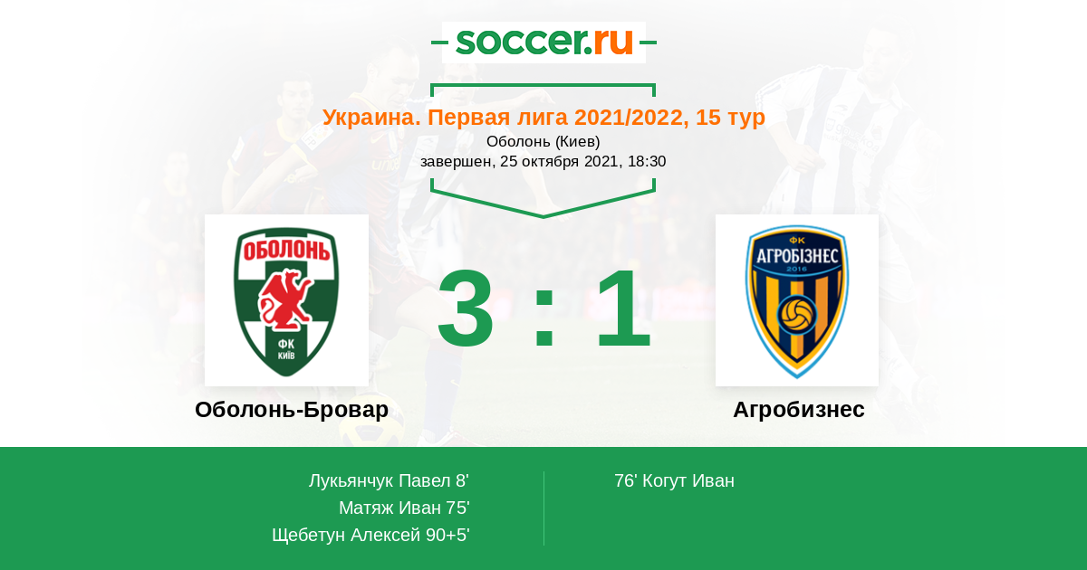 Протокол матча Оболонь-Бровар против Агробизнес