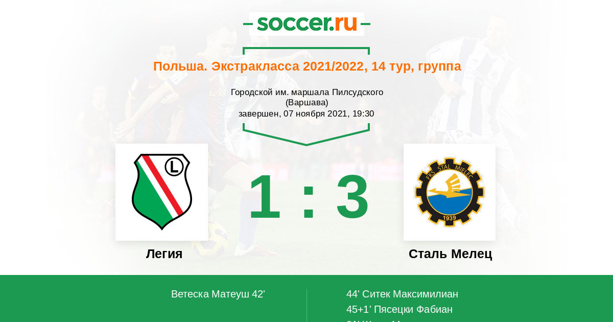 Протокол матча Легия против Сталь Мелец