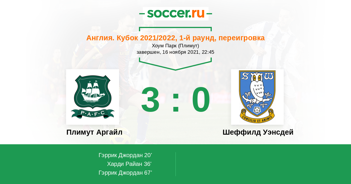 Протокол матча Плимут Аргайл против Шеффилд Уэнсдей