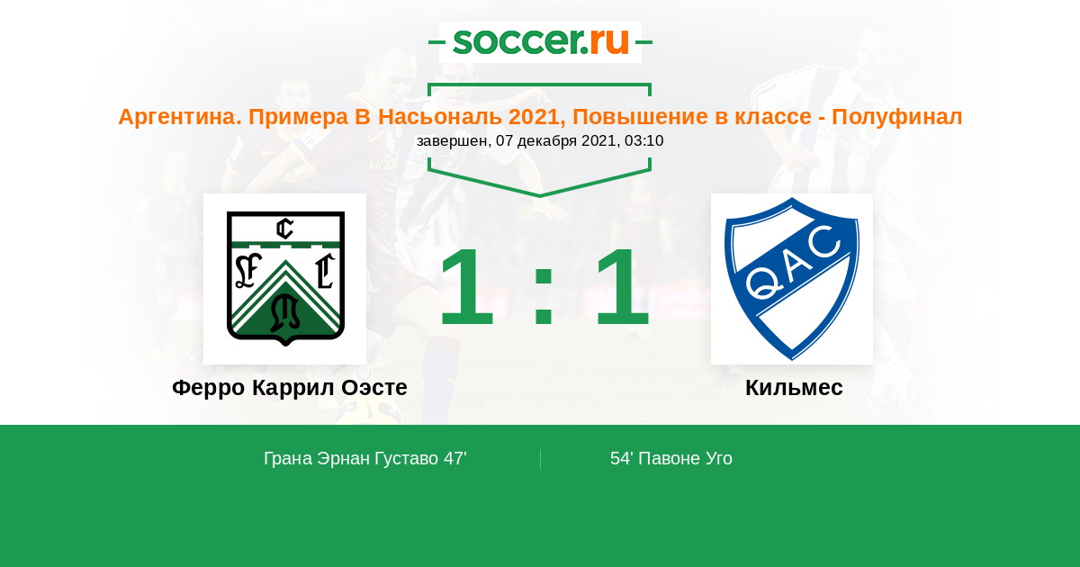 Протокол матча Ферро Каррил Оэсте против Кильмес