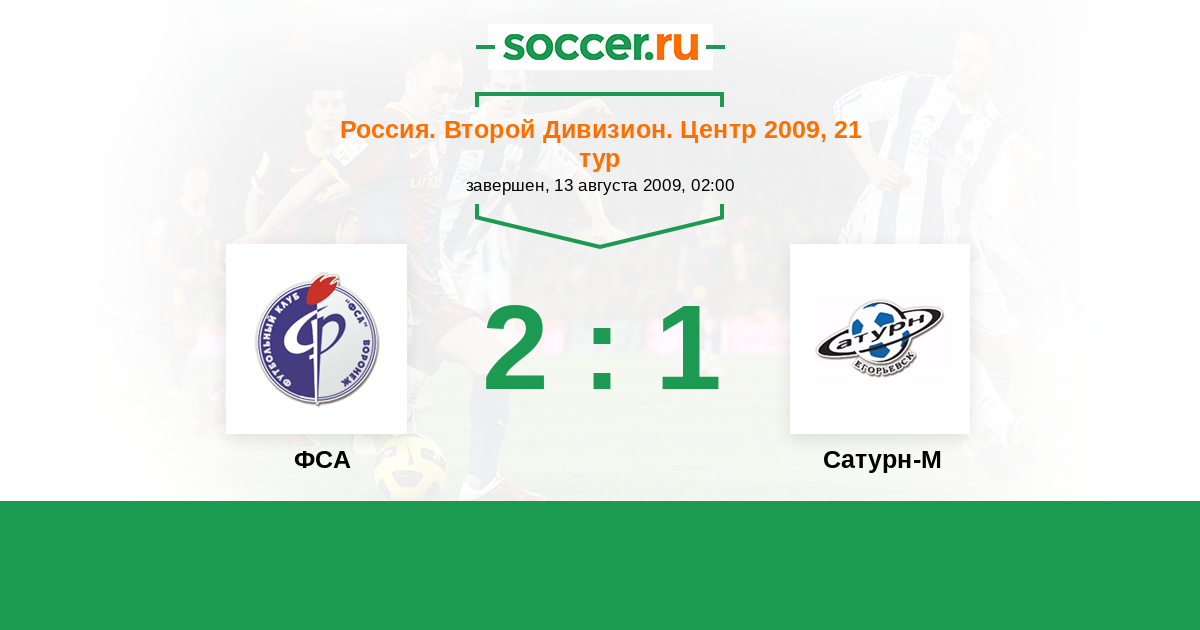 Россия. Вторая лига. Группа 3 13.05.2009 Сатурн-2 Логотип футбольный клуб Сатурн-2 (Раменское) 1:0 Логотип футбольный клуб ФСА (Воронеж) ФСА