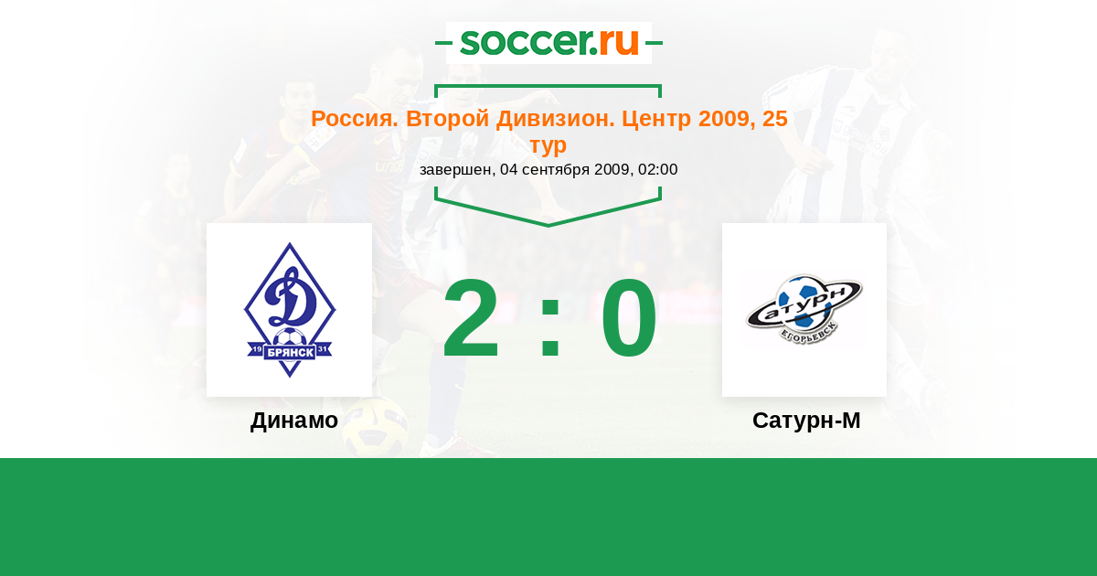 Россия. Вторая лига. Группа 3 04.06.2009 Сатурн-2 Логотип футбольный клуб Сатурн-2 (Раменское) 0:0 Логотип футбольный клуб Динамо Брянск Динамо Брянск