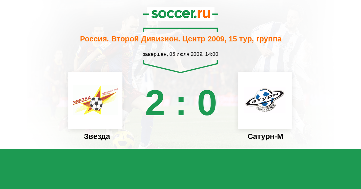 Россия. Вторая лига. Группа 3 05.10.2009 Сатурн-2 Логотип футбольный клуб Сатурн-2 (Раменское) 2:2 Логотип футбольный клуб Звезда (Серпухов) Звезда