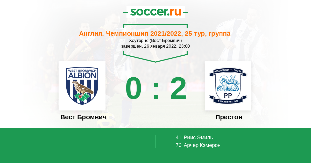 Протокол матча Вест Бромвич против Престон