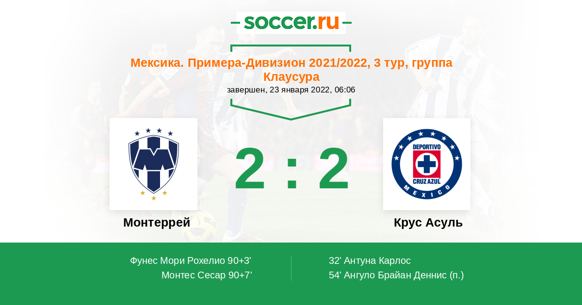 Гол90+7' (2:2) Монтес Сесар (3) (Меса Максимилиано (11))