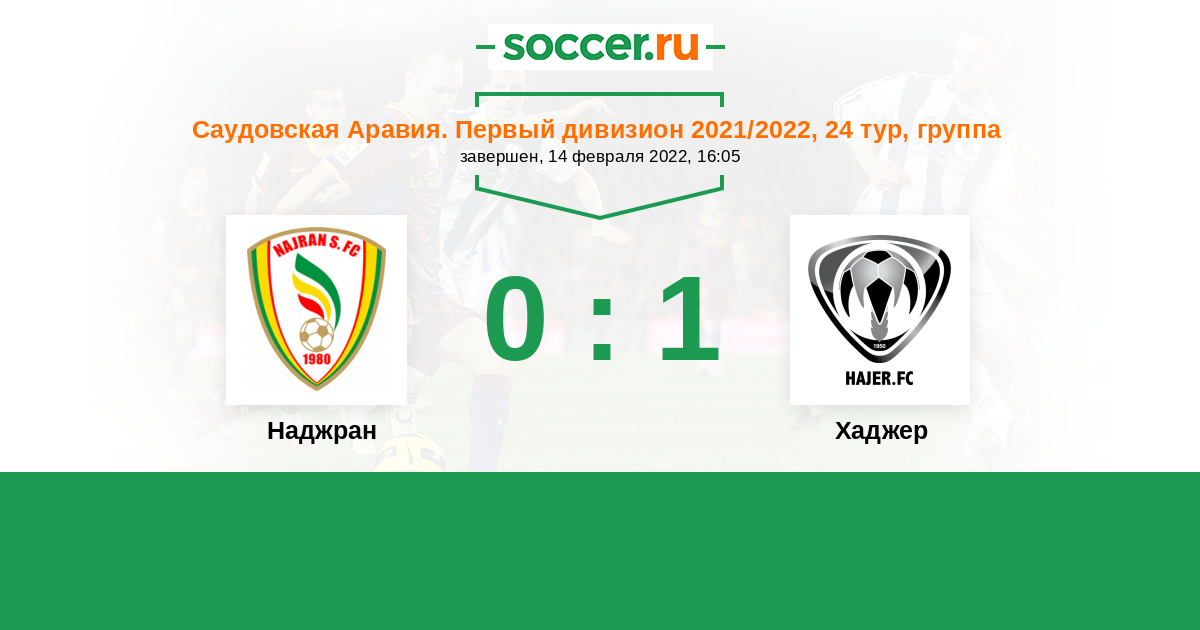 Саудовская Аравия. Первый дивизион 16.05.2021 Наджран Логотип футбольный клуб Наджран 0:1 Логотип футбольный клуб Хаджер (Эль-Хофуф) Хаджер