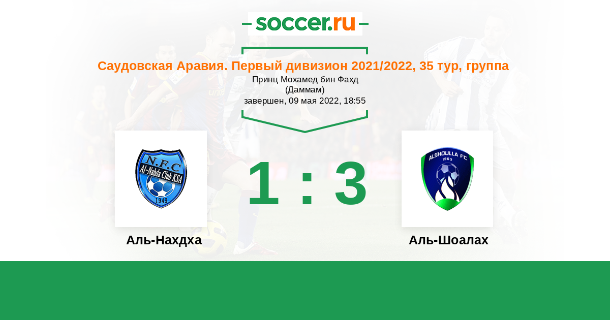 Саудовская Аравия. Первый дивизион 31.05.2021 Аль-Нахдха Логотип футбольный клуб Аль-Нахдха (Эд-Даммам) 1:0 Логотип футбольный клуб Аль-Шоалах (Эль-Хардж) Аль-Шоалах
