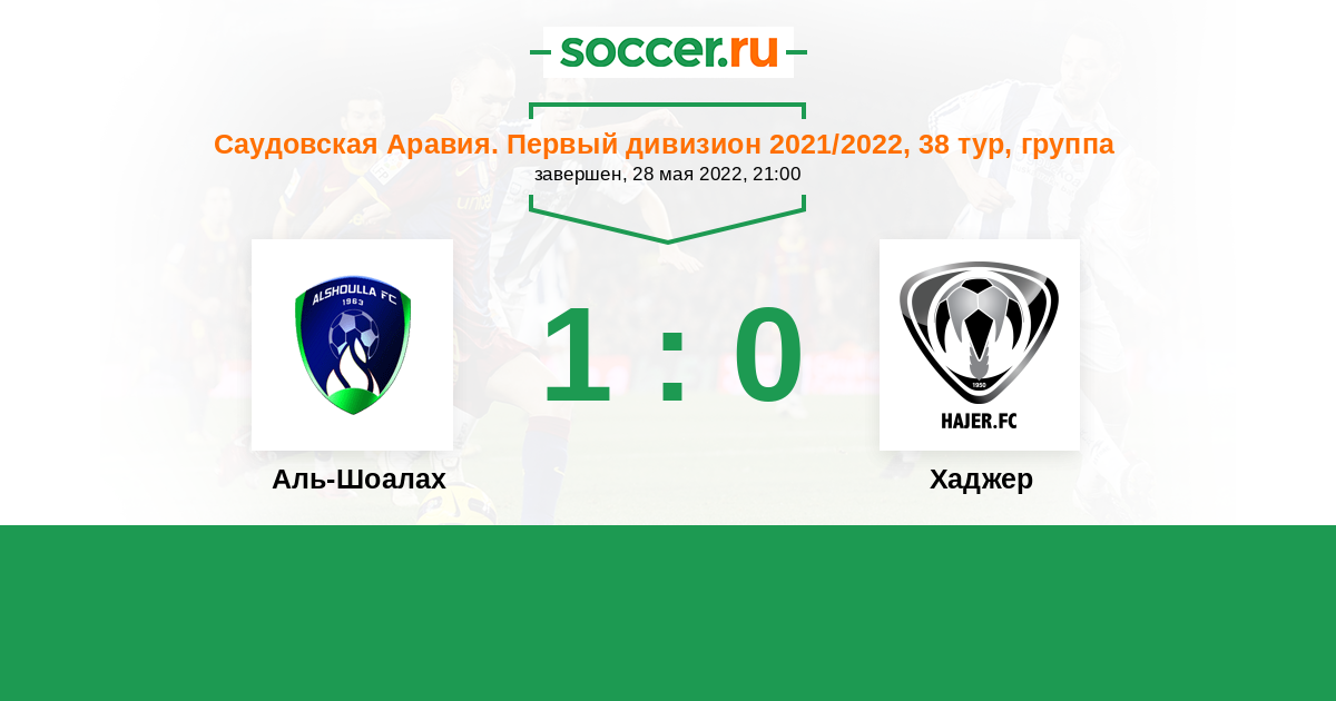 Саудовская Аравия. Первый дивизион 01.02.2023 Аль-Шоалах Логотип футбольный клуб Аль-Шоалах (Эль-Хардж) 1:2 Логотип футбольный клуб Хаджер (Эль-Хофуф) Хаджер