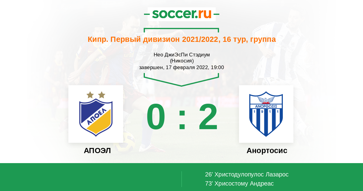 26' (0:1) Христодулопулос Лазарос (10) (Амбарцумян Оганес (19))