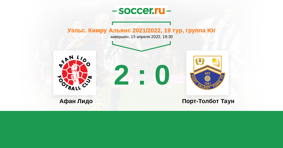 Уэльс. Кимру Альянс 18.04.2022 Порт-Толбот Таун Логотип футбольный клуб Порт-Толбот Таун 0:2 Логотип футбольный клуб Афан Лидо (Порт-Толбот) Афан Лидо