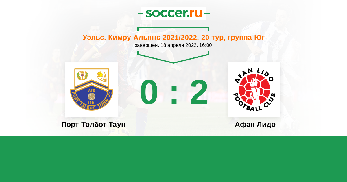 Уэльс. Премьер-Лига 07.04.2014 Порт-Толбот Таун Логотип футбольный клуб Порт-Толбот Таун 0:0 Логотип футбольный клуб Афан Лидо (Порт-Толбот) Афан Лидо