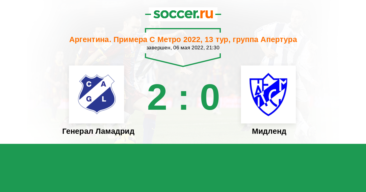 Аргентина. Примера С Метро 16.05.2021 Мидленд Логотип футбольный клуб Мидленд (Либертад) 1:2 Логотип Генерал Ламадрид (Буэнос-Айрес) Генерал Ламадрид