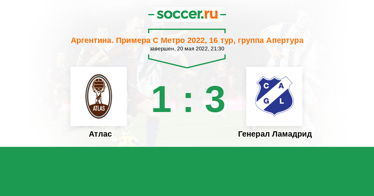 Аргентина. Примера С Метро 16.04.2023 Атлас Логотип футбольный клуб Атлас (Хенераль Родригес) 1:1 Логотип Генерал Ламадрид (Буэнос-Айрес) Генерал Ламадрид