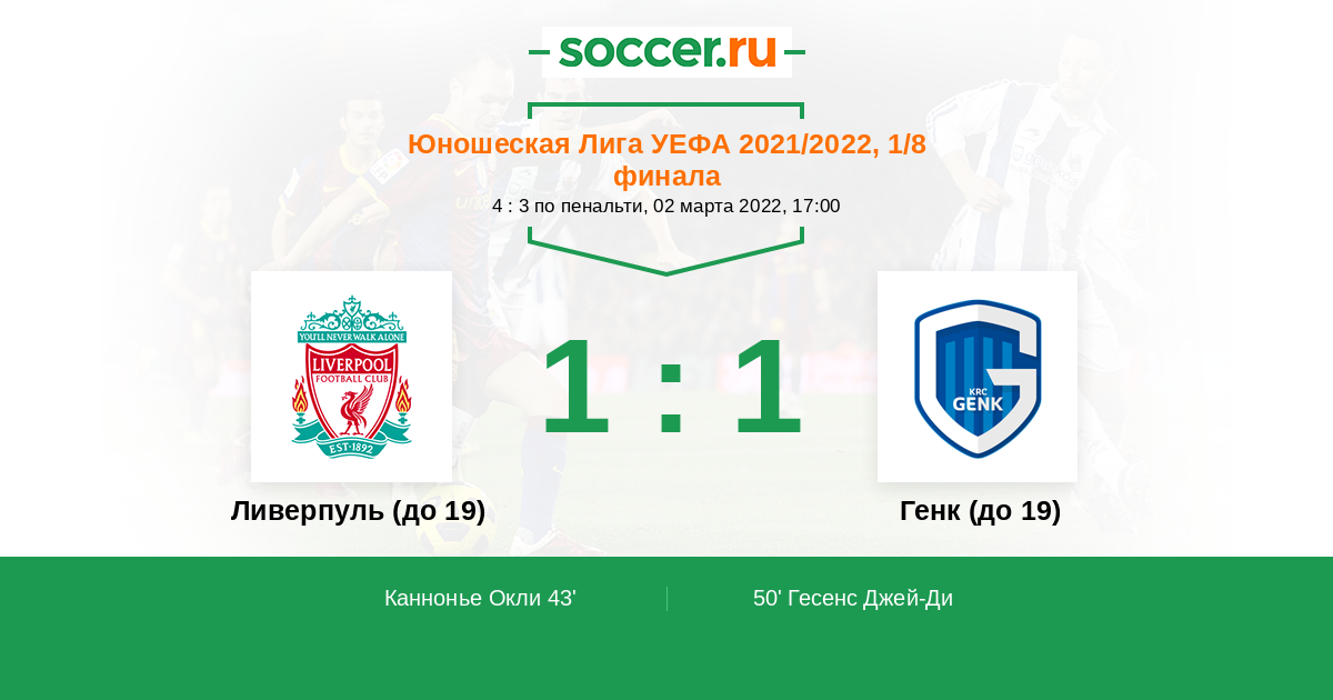 Протокол матча Ливерпуль (до 19) против Генк (до 19)