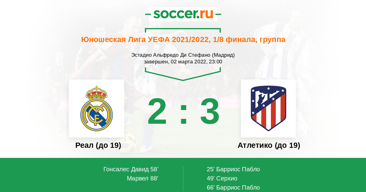 Протокол матча Реал (до 19) против Атлетико (до 19)