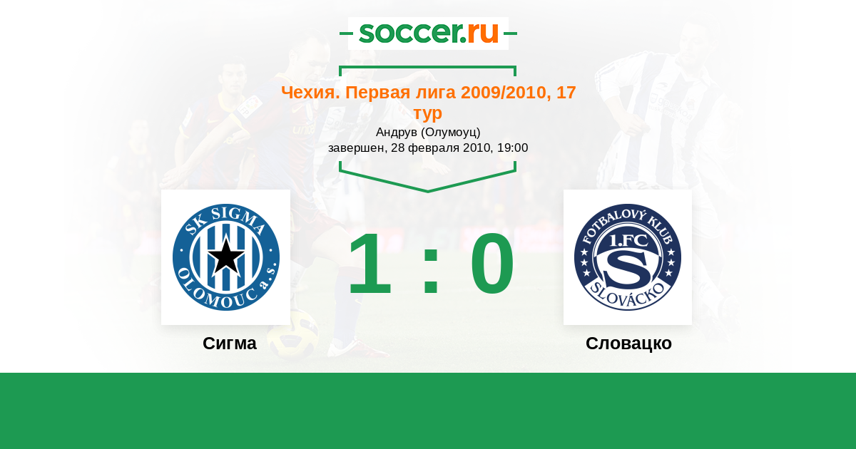 Чехия. Первая Лига 09.08.2009 Словацко Логотип футбольный клуб Словацко (Угерске-Градиште) 2:0 Логотип футбольный клуб Сигма (Оломоуц) Сигма