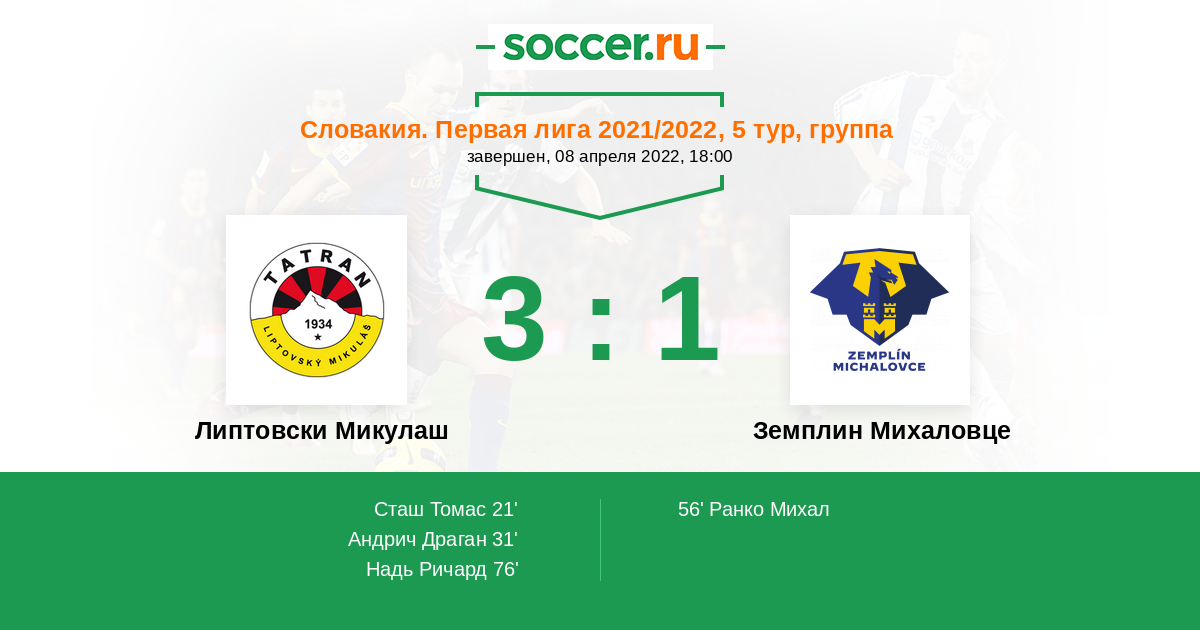 Протокол матча Липтовски Микулаш против Земплин Михаловце