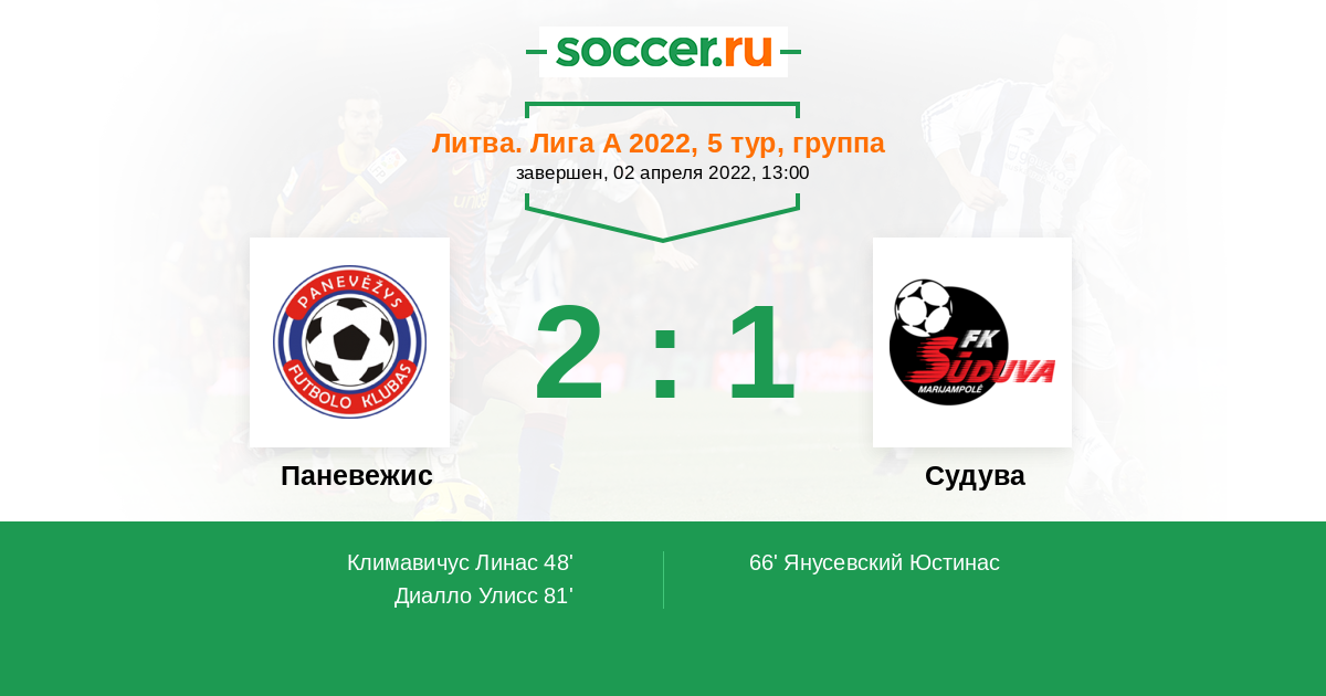 66' (1:1) Янусевский Юстинас (3) (Мбомбо Куле (22))