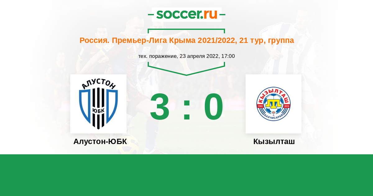 Россия. Премьер-Лига Крыма 23.04.2022 Алустон-ЮБК Логотип футбольный клуб Алустон-ЮБК (Алушта) 3:0 Логотип футбольный клуб Кызылташ (Бахчисарай) Кызылташ
