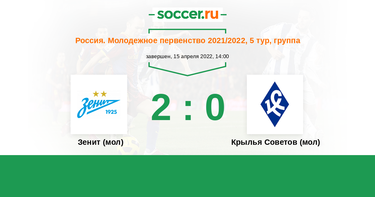 Россия. Премьер-Лига U21 20.05.2022 Крылья Советов (мол) Логотип футбольный клуб Крылья Советов (мол) (Самара) 2:5 Логотип футбольный клуб Зенит (мол) (Санкт-Петербург) Зенит (мол)
