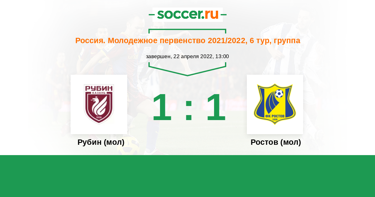 Россия. Премьер-Лига U21 05.04.2022 Ростов (мол) Логотип футбольный клуб Ростов (мол) (Ростов-на-Дону) 1:1 Логотип футбольный клуб Рубин (мол) (Казань) Рубин (мол)
