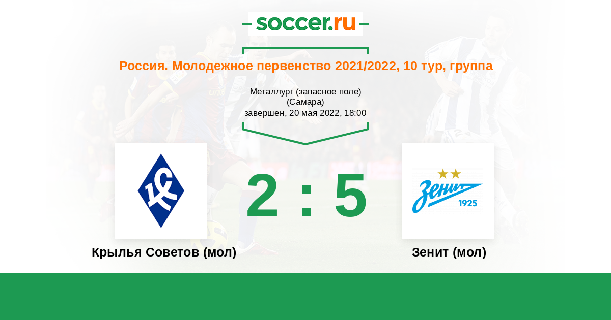 Россия. Премьер-Лига U21 12.05.2017 Крылья Советов (мол) Логотип футбольный клуб Крылья Советов (мол) (Самара) 0:2 Логотип футбольный клуб Зенит (мол) (Санкт-Петербург) Зенит (мол)