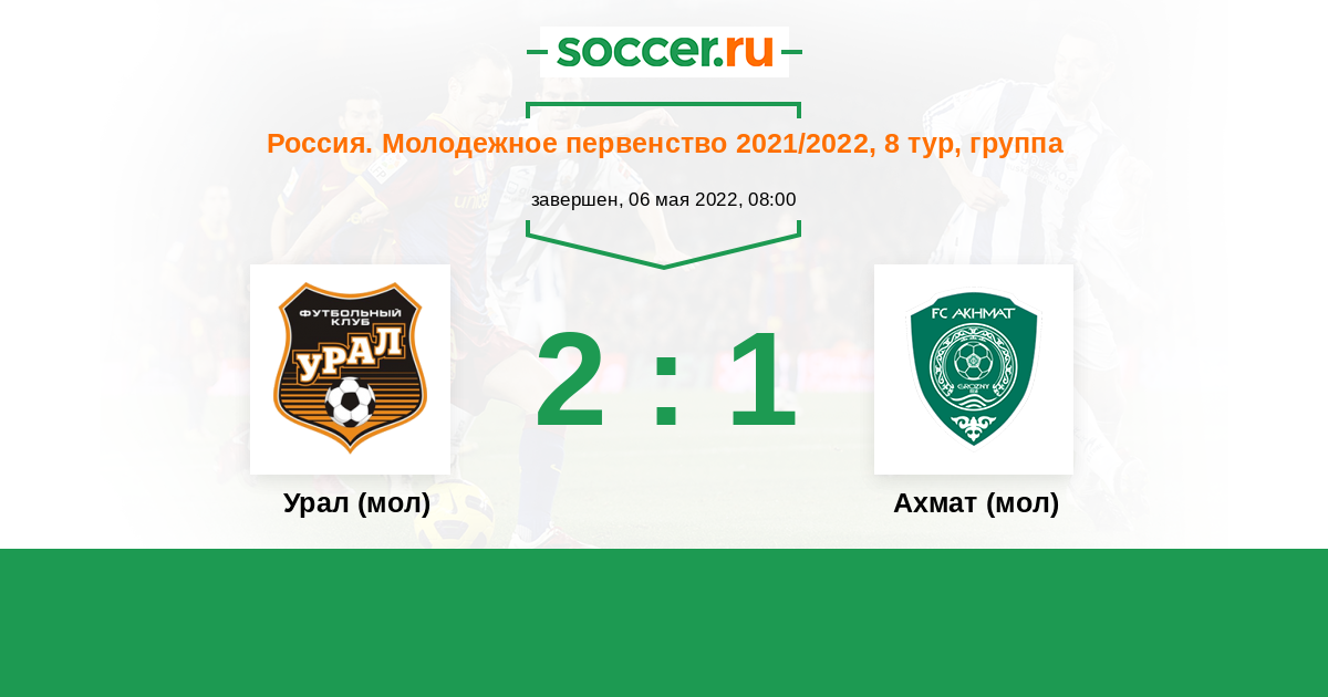 Россия. Премьер-Лига U21 02.05.2025 Урал (мол) Логотип футбольный клуб Урал (мол) (Екатеринбург) 5:1 Логотип футбольный клуб Ахмат (мол) (Грозный) Ахмат (мол)
