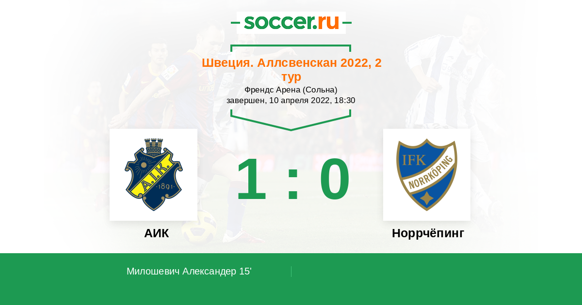 15' (1:0) Милошевич Александер (5) (Ларссон Джордан (19))