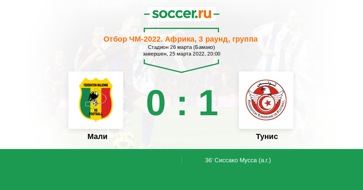 Мали прошел групповой этап, не пропустив ни одного гола за 6 матчей. Тунис пропустил лишь дважды в 6 играх. Обе команды отличаются надежной обороной поэтому вряд ли в матче будет забито больше одного гола.