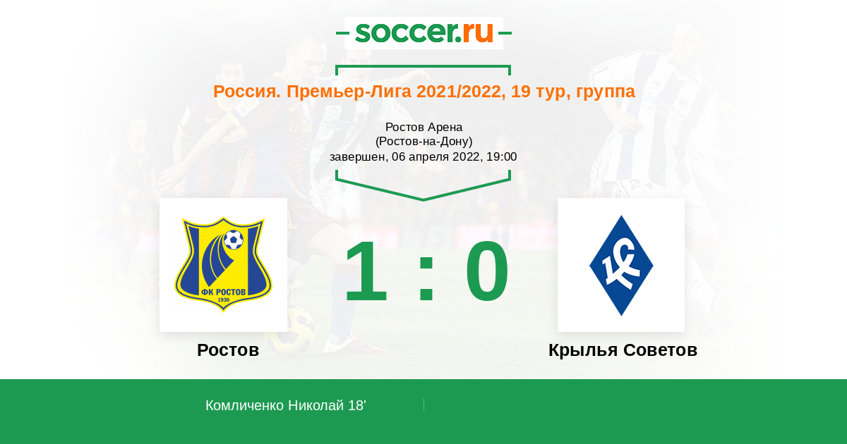 «Ростов» поставил себя в очень непростое положение, уступив в последнем туре прямому конкуренту в борьбе за выживание. Теперь права на ошибку у него нет. У «Крыльев Советов», как показал матч с «Уфой», есть проблемы с мотивацией, да и в обороне ошибки допускают регулярно. «Ростов» способен обраться и взять в этой встрече все три очка.