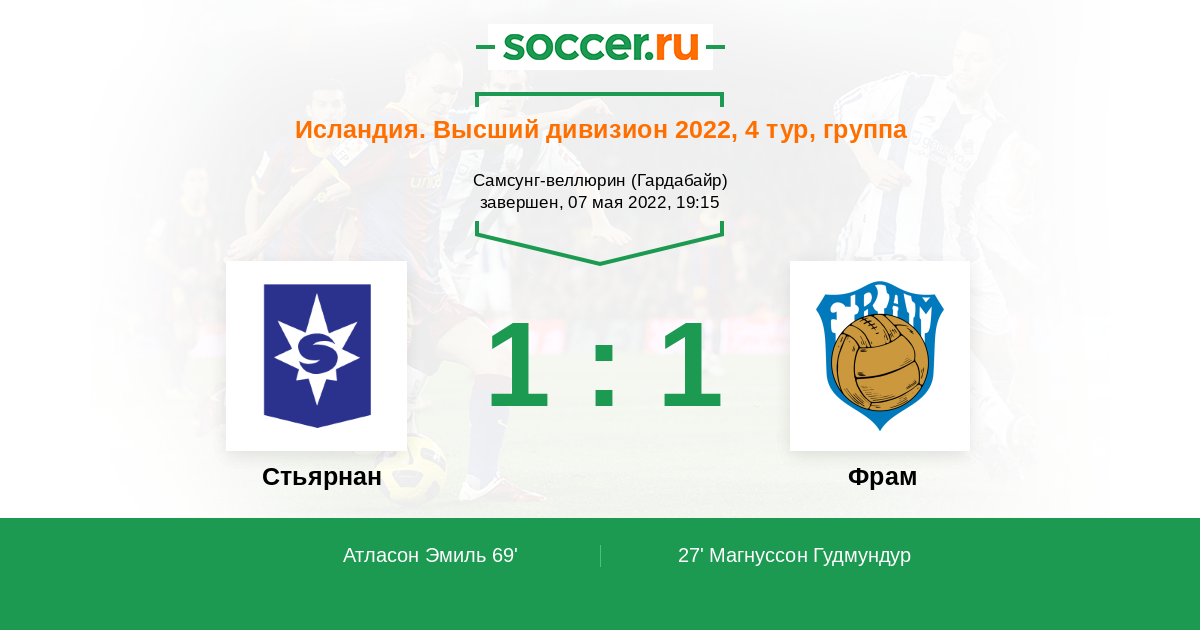 27' (0:1) Магнуссон Гудмундур (77) (Элиссон Алекс Фрейр (17))