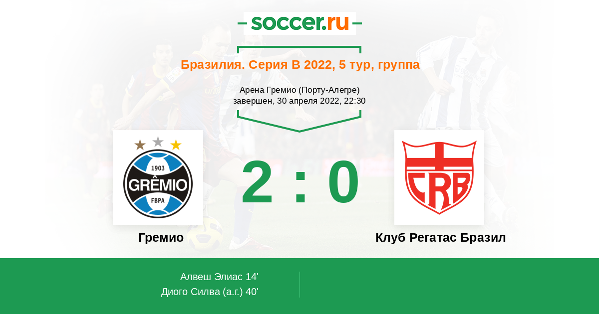 14' (1:0) Алвеш Элиас (18) (Соуза Диего (29))