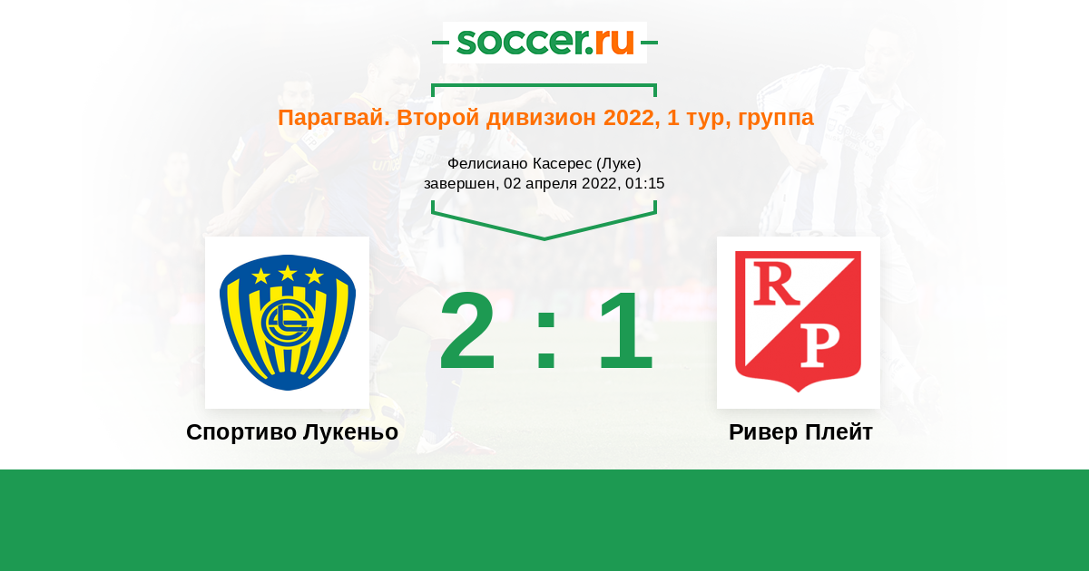 Парагвай. Второй дивизион 10.07.2022 Ривер Плейт Логотип футбольный клуб Ривер Плейт (Асунсьон) 1:2 Логотип футбольный клуб Спортиво Лукеньо Спортиво Лукеньо