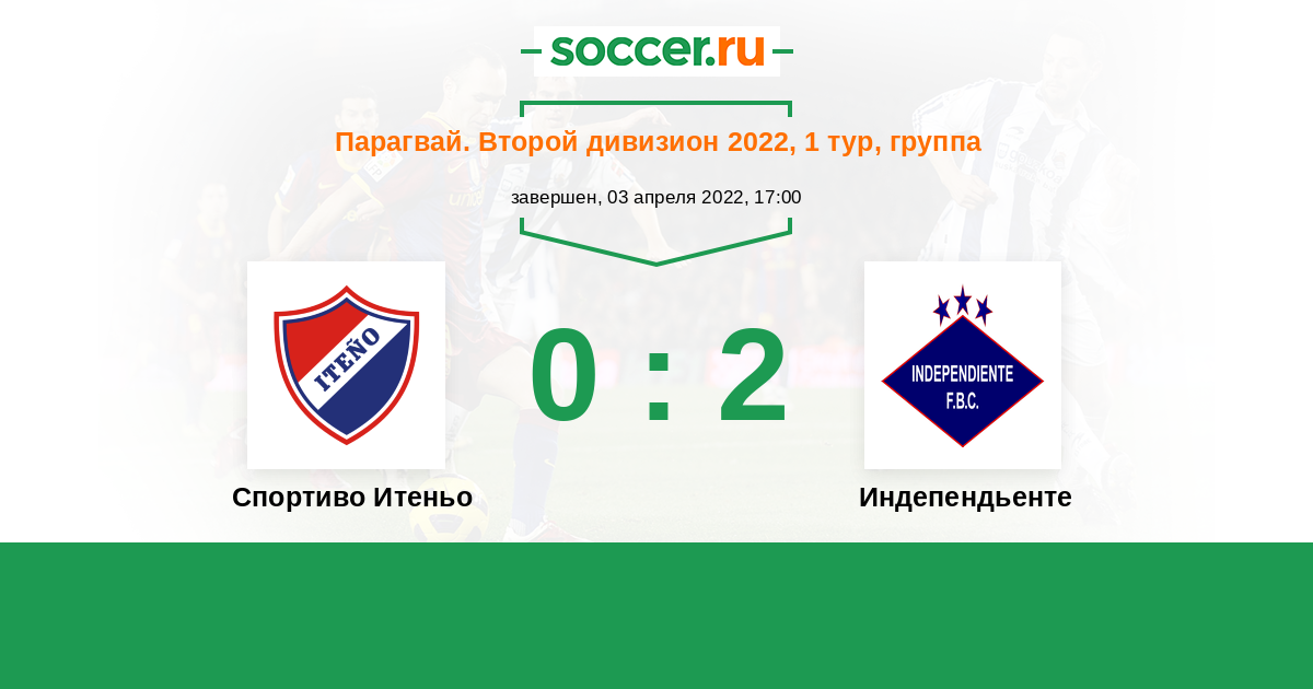Парагвай. Второй дивизион 10.07.2022 Индепендьенте Логотип футбольный клуб Индепендьенте (Луке) 1:0 Логотип футбольный клуб Спортиво Итеньо (Ита) Спортиво Итеньо