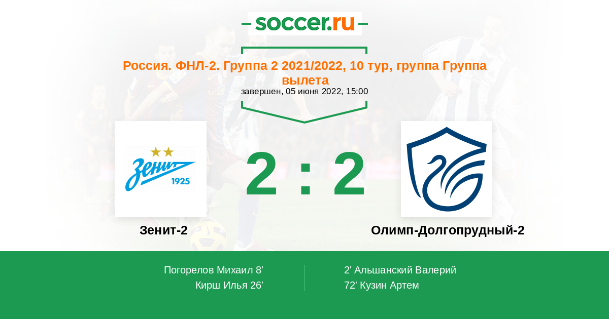 Протокол матча Зенит-2 против Олимп-Долгопрудный-2