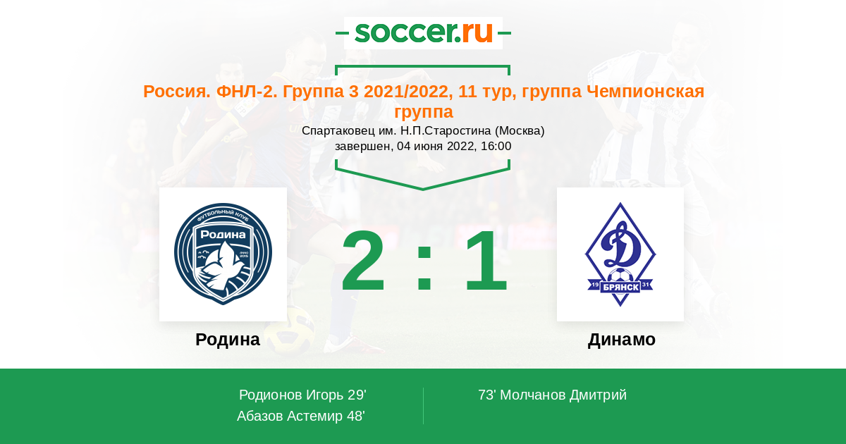 Протокол матча Родина против Динамо Брянск