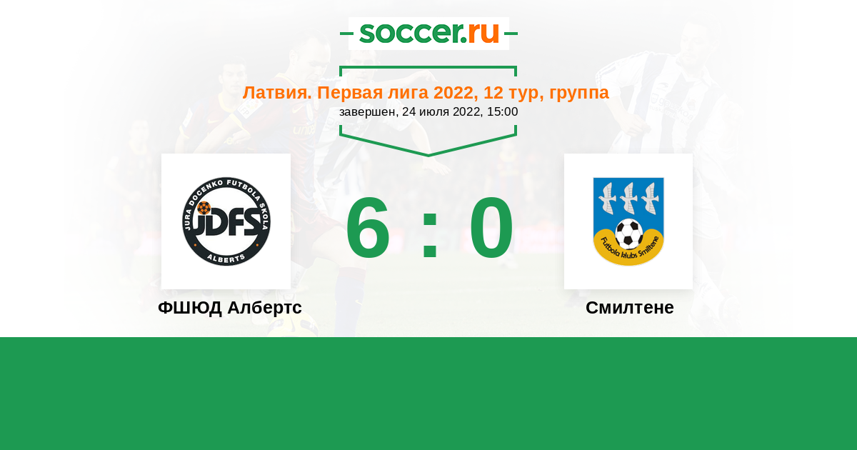 Латвия. Первая лига 27.07.2025 Смилтене Логотип футбольный клуб Смилтене 2:4 Логотип футбольный клуб ФШЮД Албертс (Рига) ФШЮД Албертс