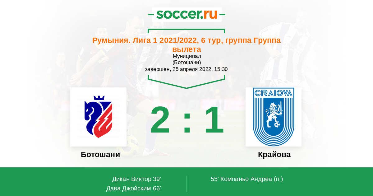 39' (1:0) Дикан Виктор (6) (Тирковеану Андрей (10))