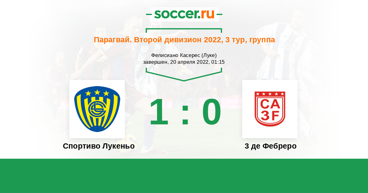 Парагвай. Второй дивизион 24.07.2022 3 де Фебреро Логотип футбольный клуб 3 де Фебреро (Сьюдад-дель-Эсте) 2:4 Логотип футбольный клуб Спортиво Лукеньо Спортиво Лукеньо