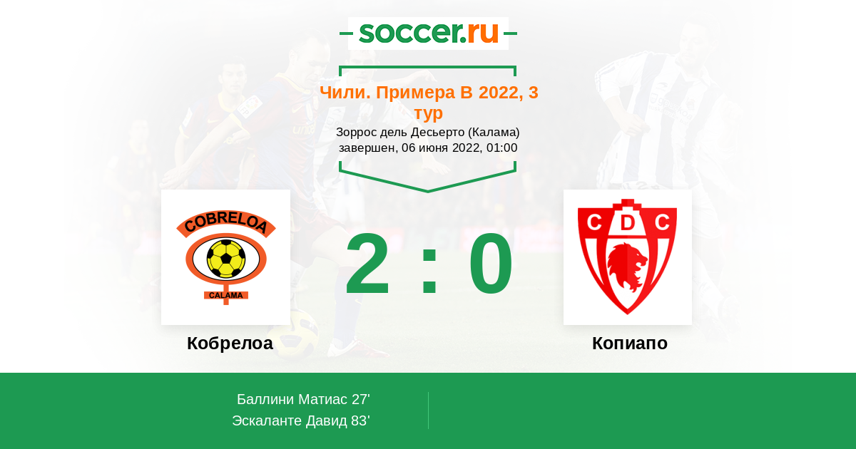 Очень много вопросов вызвал первый матч в чемпионате Чили Серии Б, там судья решил сразу игру сломать и выписал в начале игры красную карточку и матч получился супер закрытым. Поэтому в ответной игре ждем более открытого футбола, тем более встречаются лидеры и фавориты Кобрелоа против Копиапо, оба клуба в верхней части турнирной таблицы и оба клуба пропустили по 13 мячей. Будем надеяться что чёртова дюжина припушенных мячей не сыграет злую шутку в этой игре. Удачи
