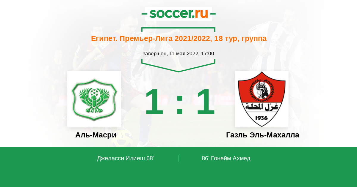 86' (1:1) Гонейм Ахмед (29) (Эль Шейк Ахмед (10))