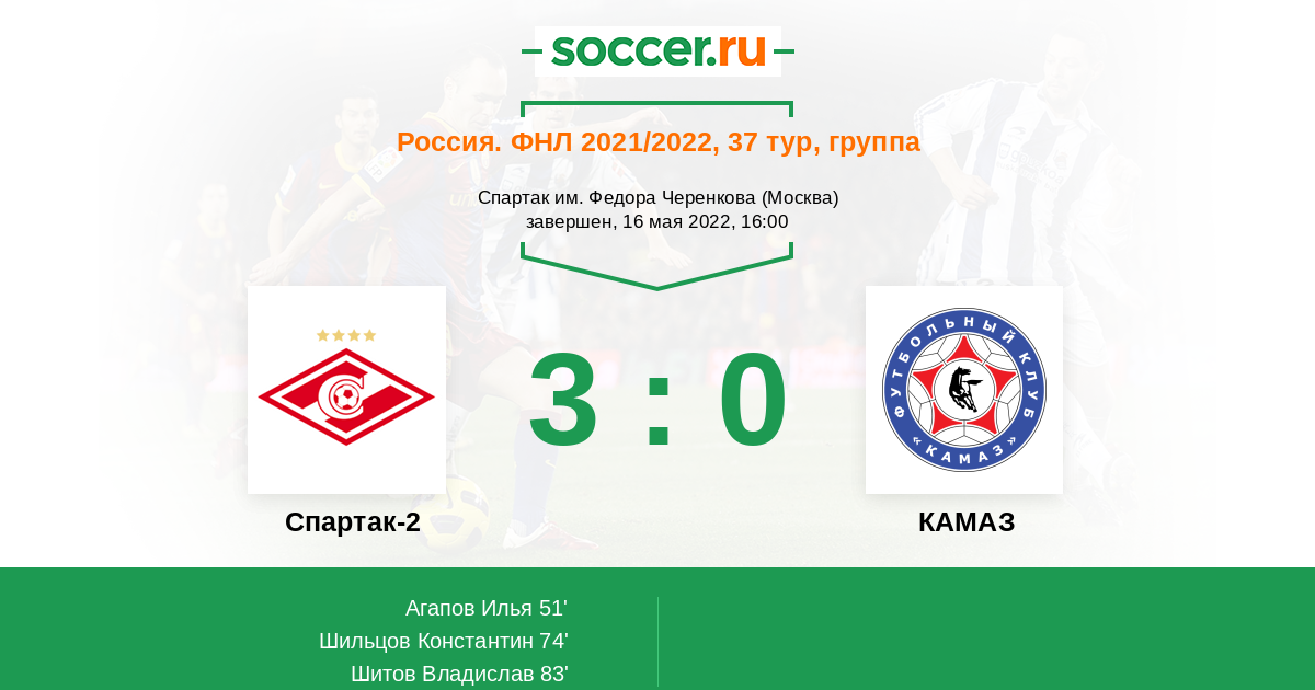 Я думаю что в этом противостоянии более чем явного фаворита на победу нет . Команда хозяев поля Спартак 2 ни на что не претендует. А вот команда гостей Камаз будет биться только на победу, потому как является одним из аутсайдеров и может покинуть ФНЛ .