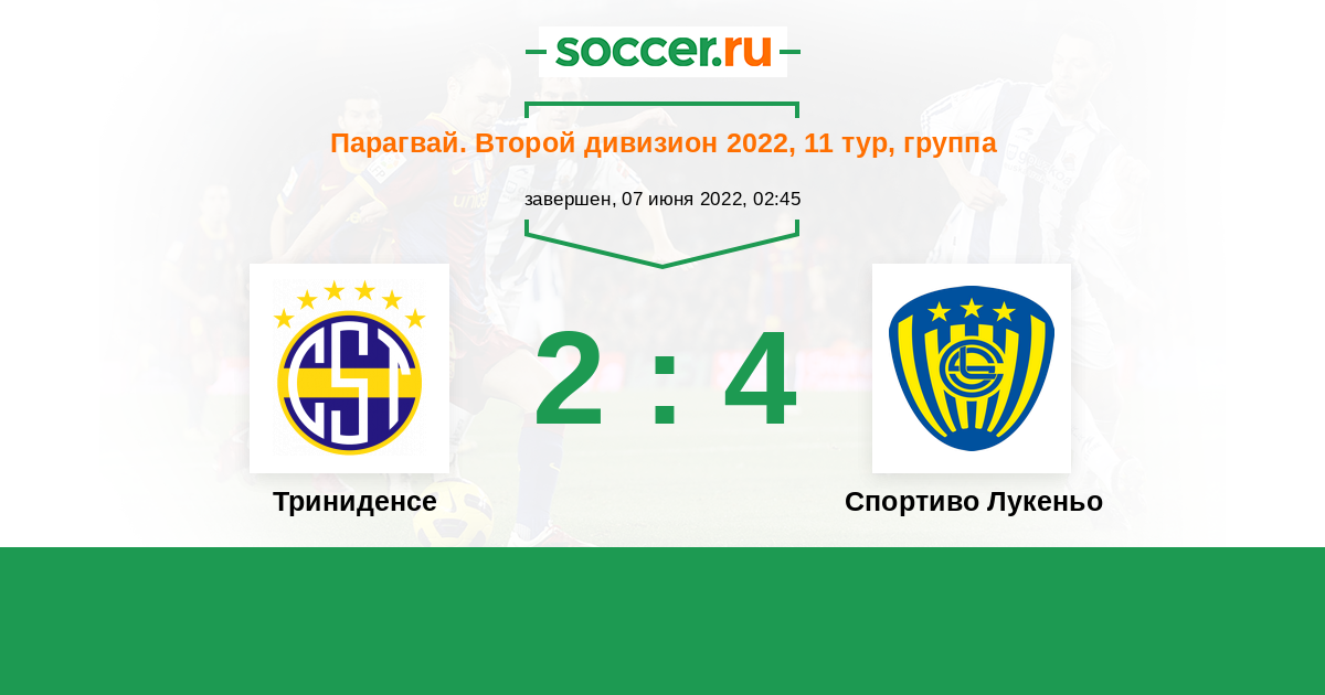 Парагвай. Второй дивизион 13.09.2022 Спортиво Лукеньо Логотип футбольный клуб Спортиво Лукеньо 0:0 Логотип футбольный клуб Триниденсе (Асунсьон) Триниденсе