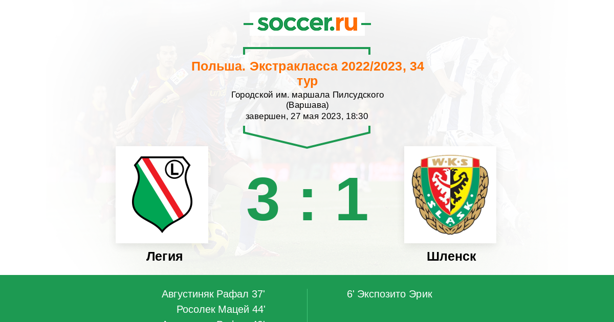 Протокол матча Легия против Шленск