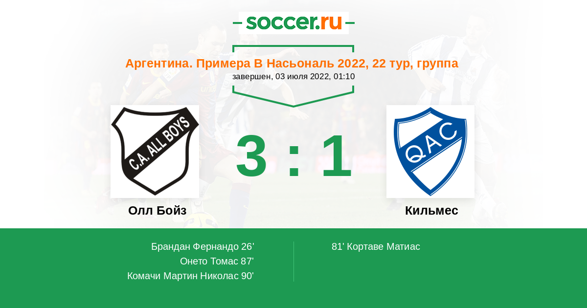 Протокол матча Олл Бойз против Кильмес