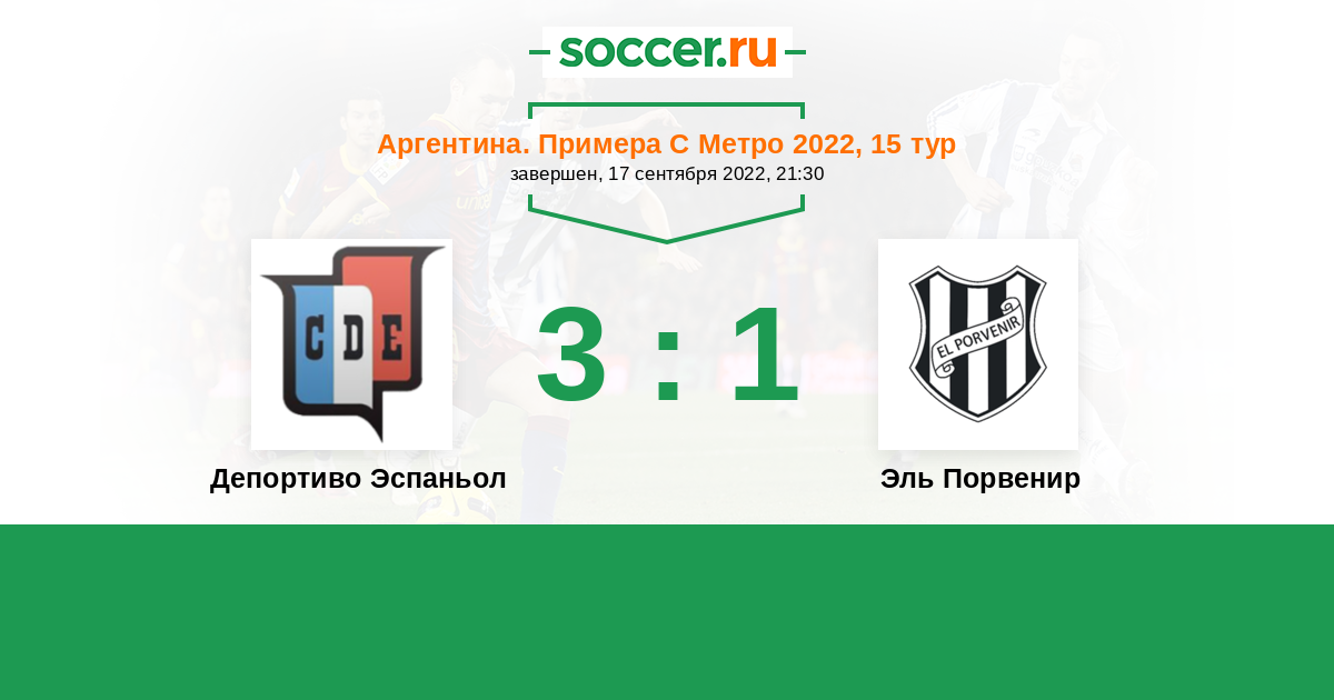 Аргентина. Примера С Метро 15.05.2022 Эль Порвенир Логотип футбольный клуб Эль Порвенир (Буэнос-Айрес) 0:2 Логотип футбольный клуб Депортиво Эспаньол (Буэнос-Айрес) Депортиво Эспаньол