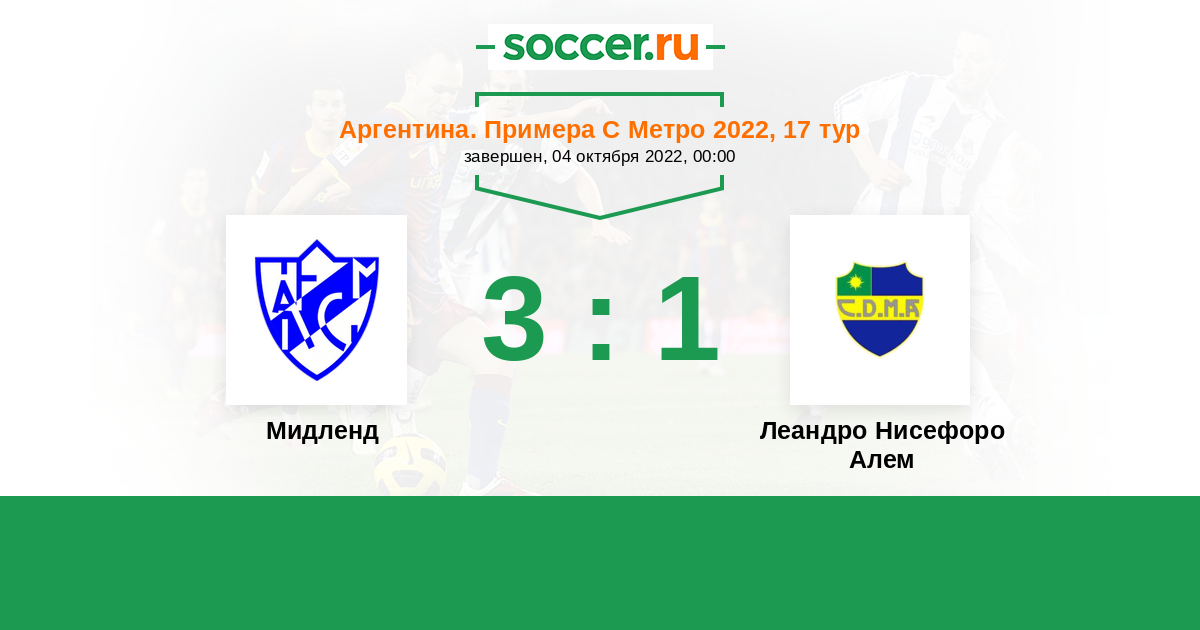 Аргентина. Примера С Метро 27.04.2018 Мидленд Логотип футбольный клуб Мидленд (Либертад) 2:2 Логотип футбольный клуб Леандро Нисефоро Алем (Буэнос-Айрес) Леандро Нисефоро Алем