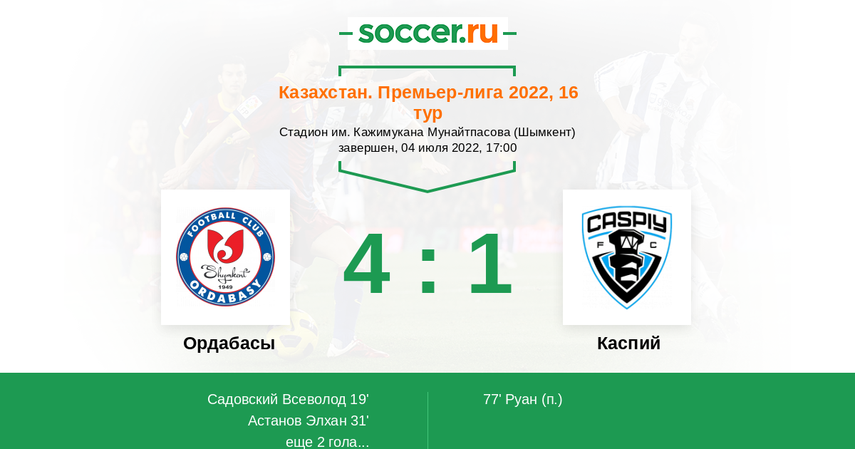К предстоящему противостоянию в более оптимальных кондициях подходят хозяева поля. У «Ордабасы» длительная полоса побед, команда ярко играет в атаке и отлично себя чувствует при поддержке родных трибун. «Каспий» в выездных матчах часто тушу-ется, в связи с чем в большинстве случаев показывает отрицательные результаты.