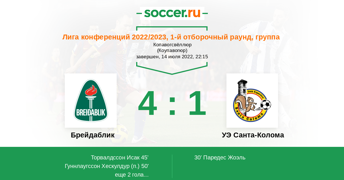 Протокол матча Брейдаблик против УЭ Санта-Колома